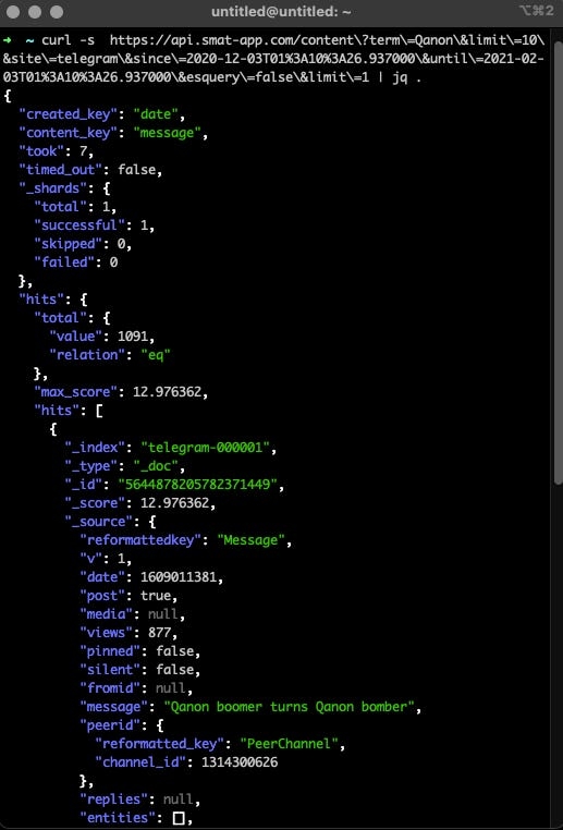 The Open Measures API is able to be fine-tuned to your exact needs. To show this, we will spell out the steps necessary to pull up to 10k of Guo Wengui’s posts on Gettr as a reference to our postarrow-up-right outlining some of the happenings on the alt-tech platform. This post builds upon the information shown in our original API guidearrow-up-right. The key element of this advanced usage is using the term query with Elasticsearch query stringarrow-up-right syntax while setting the es_query field to True.