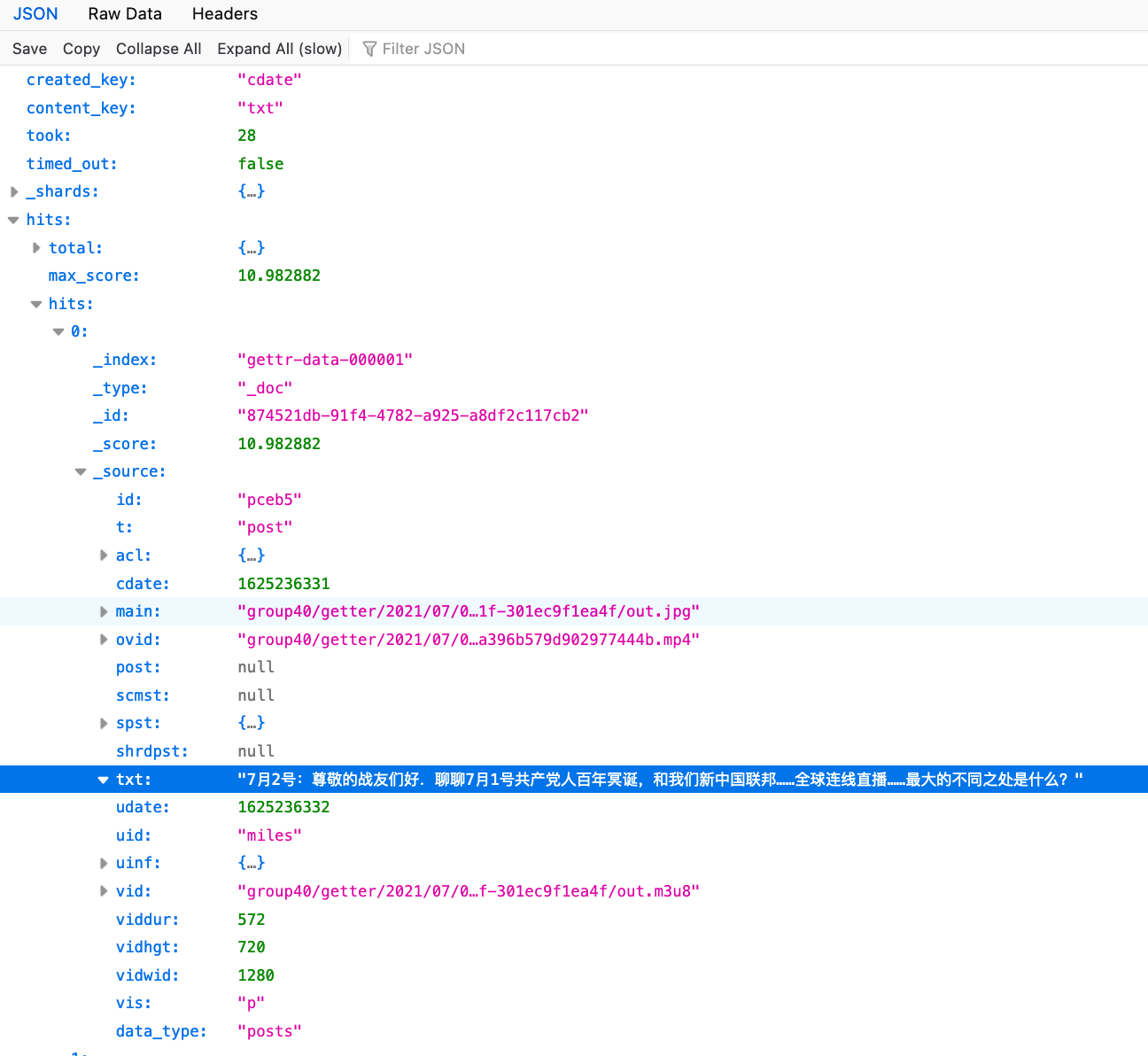 When you have the JSON opened in a new tab (here’s a direct linkarrow-up-right to the query we've just demonstrated), you may have to click to expand some of the fields. Most of the content you're interested in here will be under: hits > a number > _source. Once there, you will see the contents of the message as the field named “txt” as well as other information.