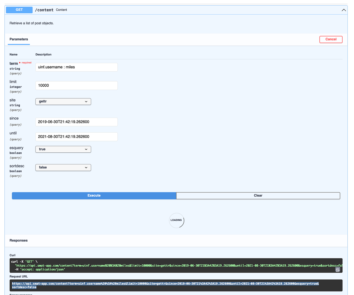Important to note: to mitigate the threat of bad actors, the Public API is rate-limited to 39 requests per day and date-limited such that all visible content is at least six months old. Get in touch to learn about options for more robust access.